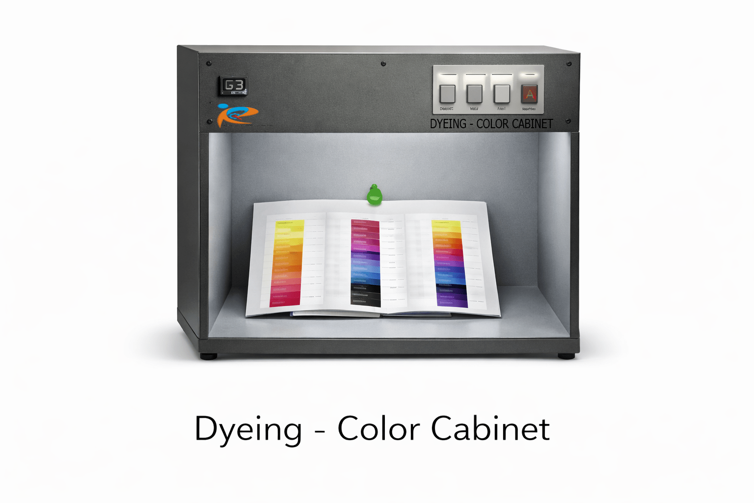 The cabinet is a simulation instrument used in quality control across industries like textiles (as suggested by “Dyeing” text), printing, and plastics to ensure color consistency and detect metamerism (where colors match under one light but not another).