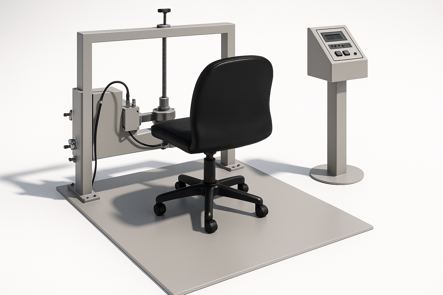 This machine is used to evaluate the durability, wear resistance, and life of office chair casters (wheels) and bases. It simulates the real-world use of an office chair by applying a load to the seat and moving the chair back and forth on a horizontal surface
